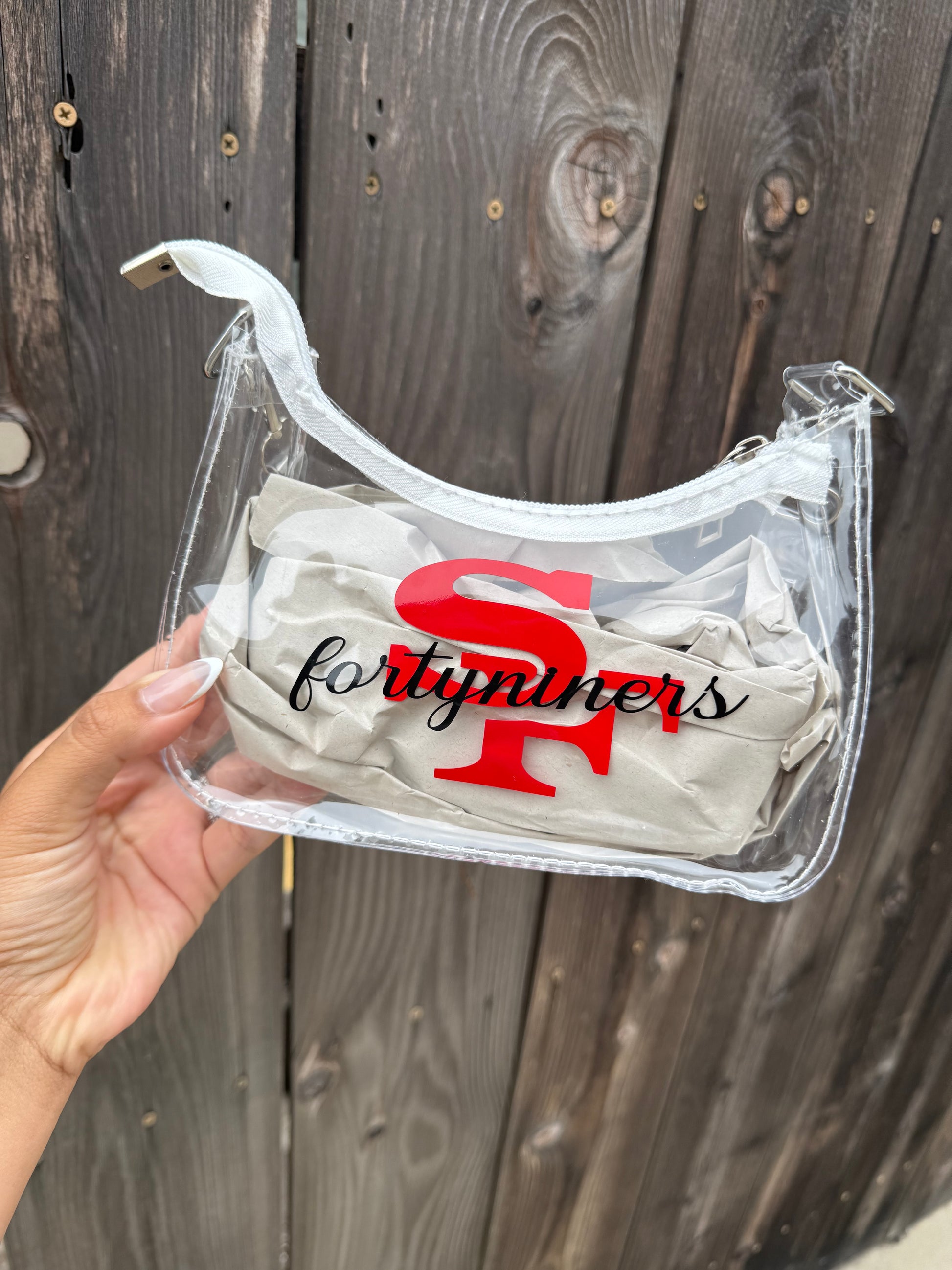 Clear mini handbag. Strap can be removed but not adjusted. PVC plastic material.