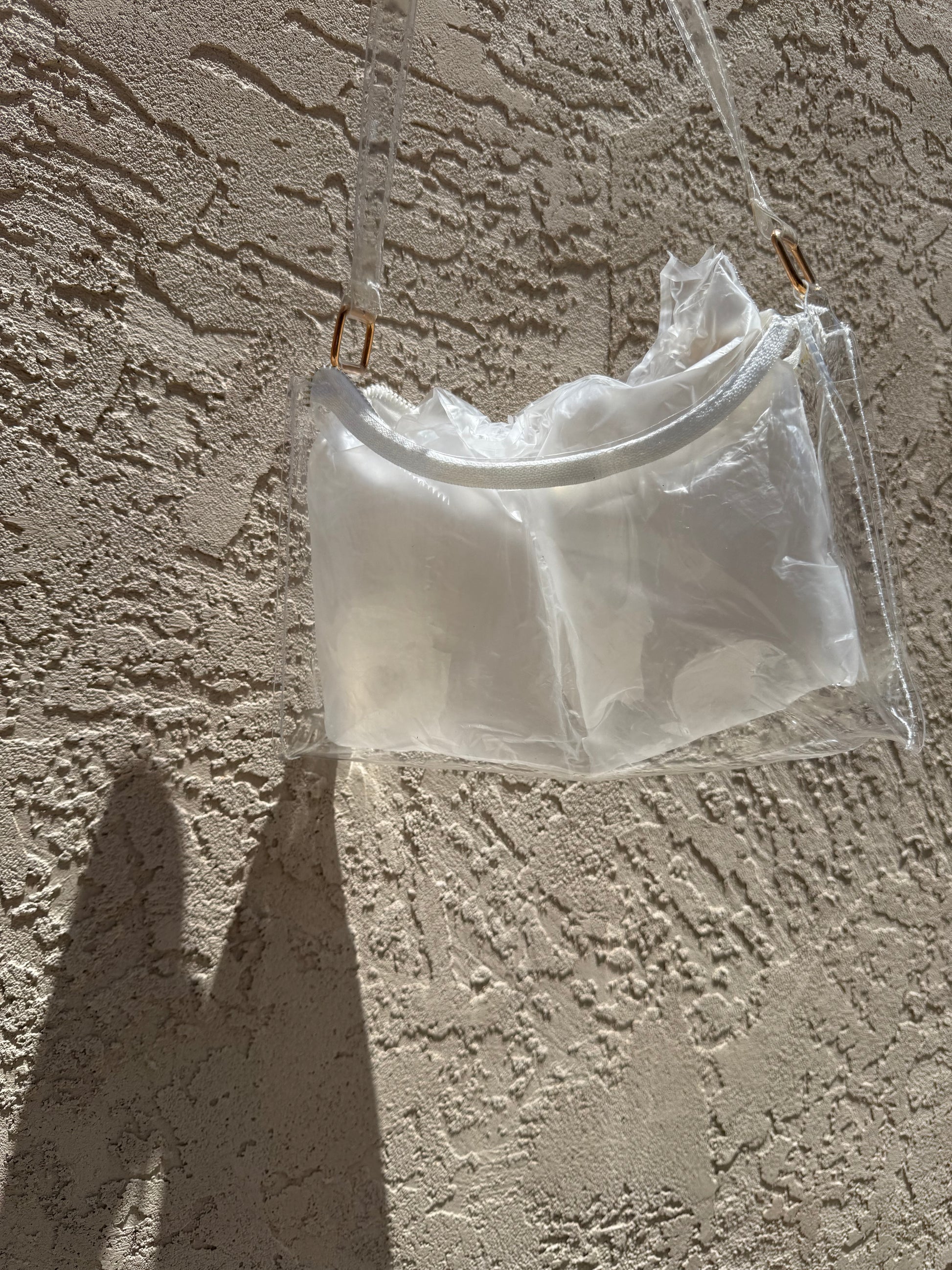 handbag, with stain damage that can't be removed. Hardware works perfectly fine. Stain damages vary per purse. Some purses come folded. SOLD AS IS. PVC plastic material.