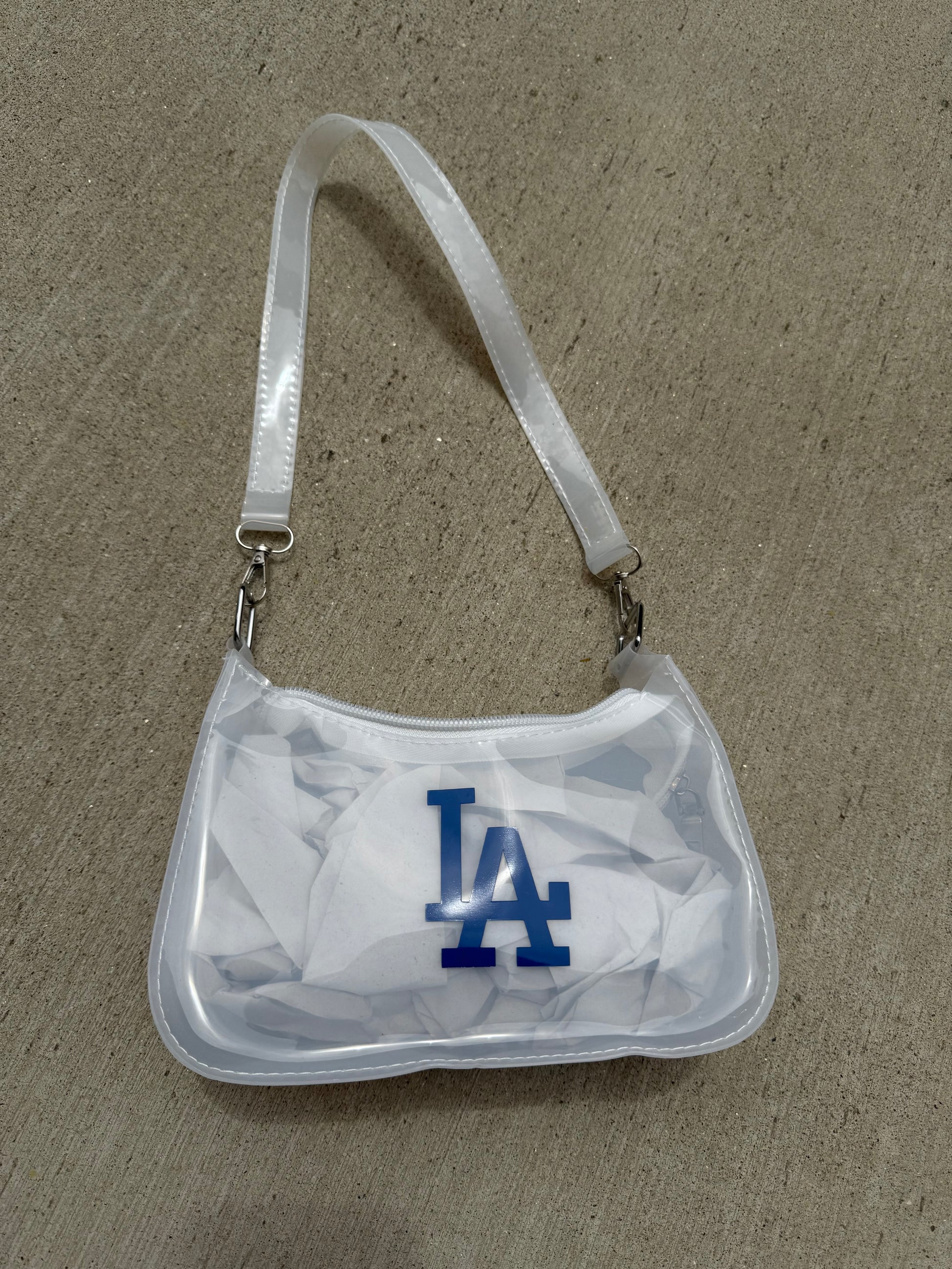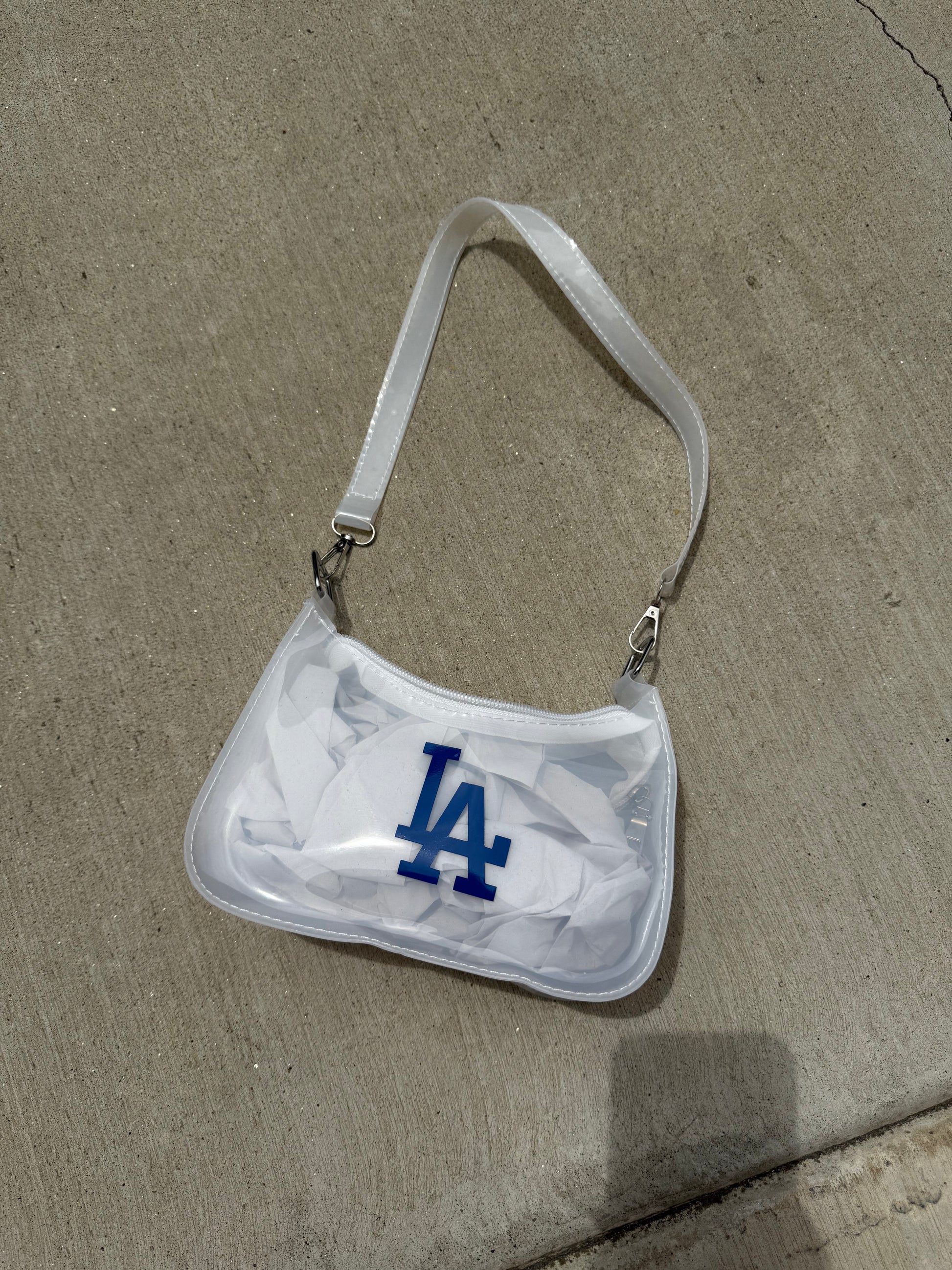 White transparent mini. Strap can be removed but not adjusted. Silver hardware.PVC plastic material.