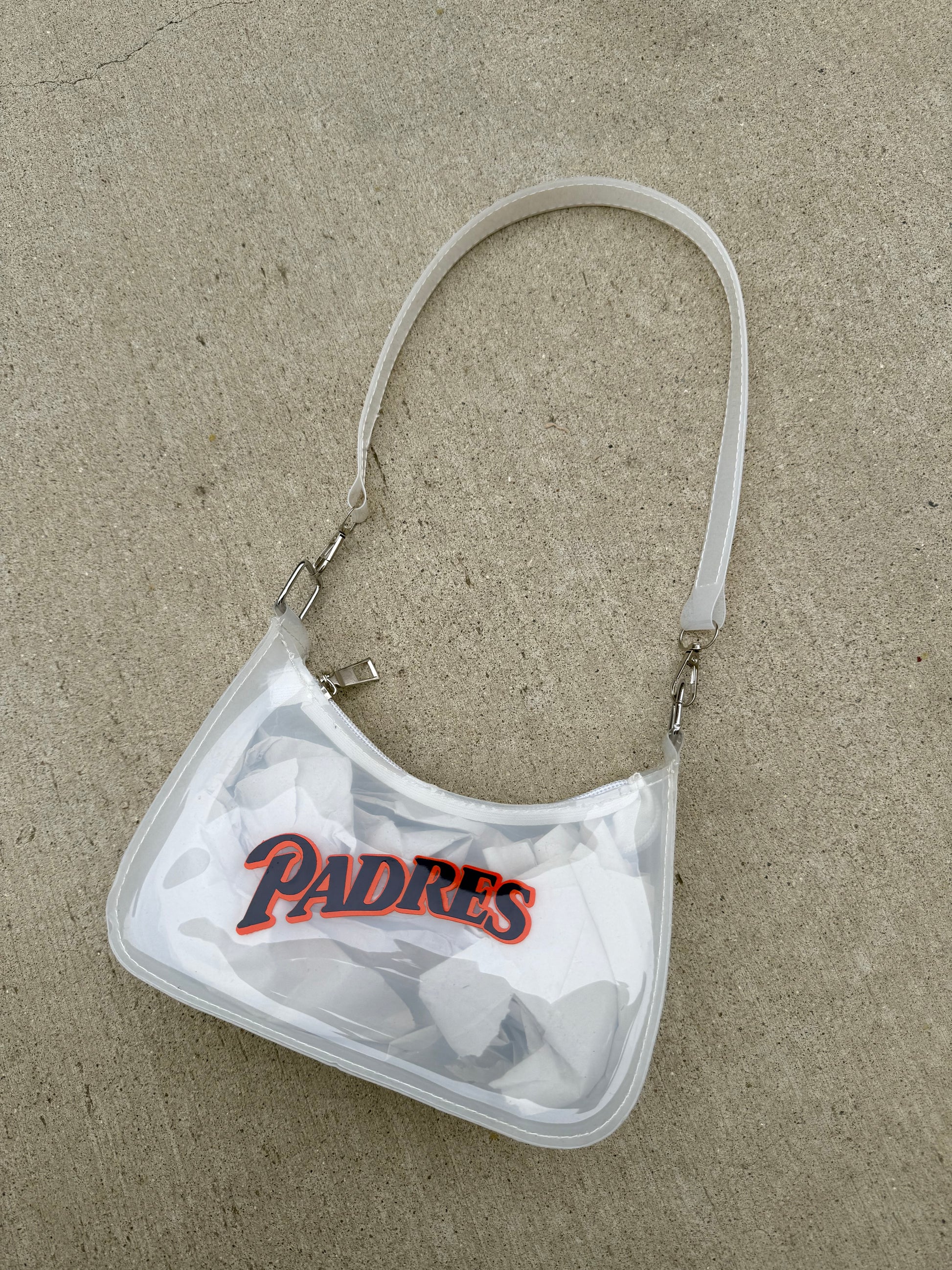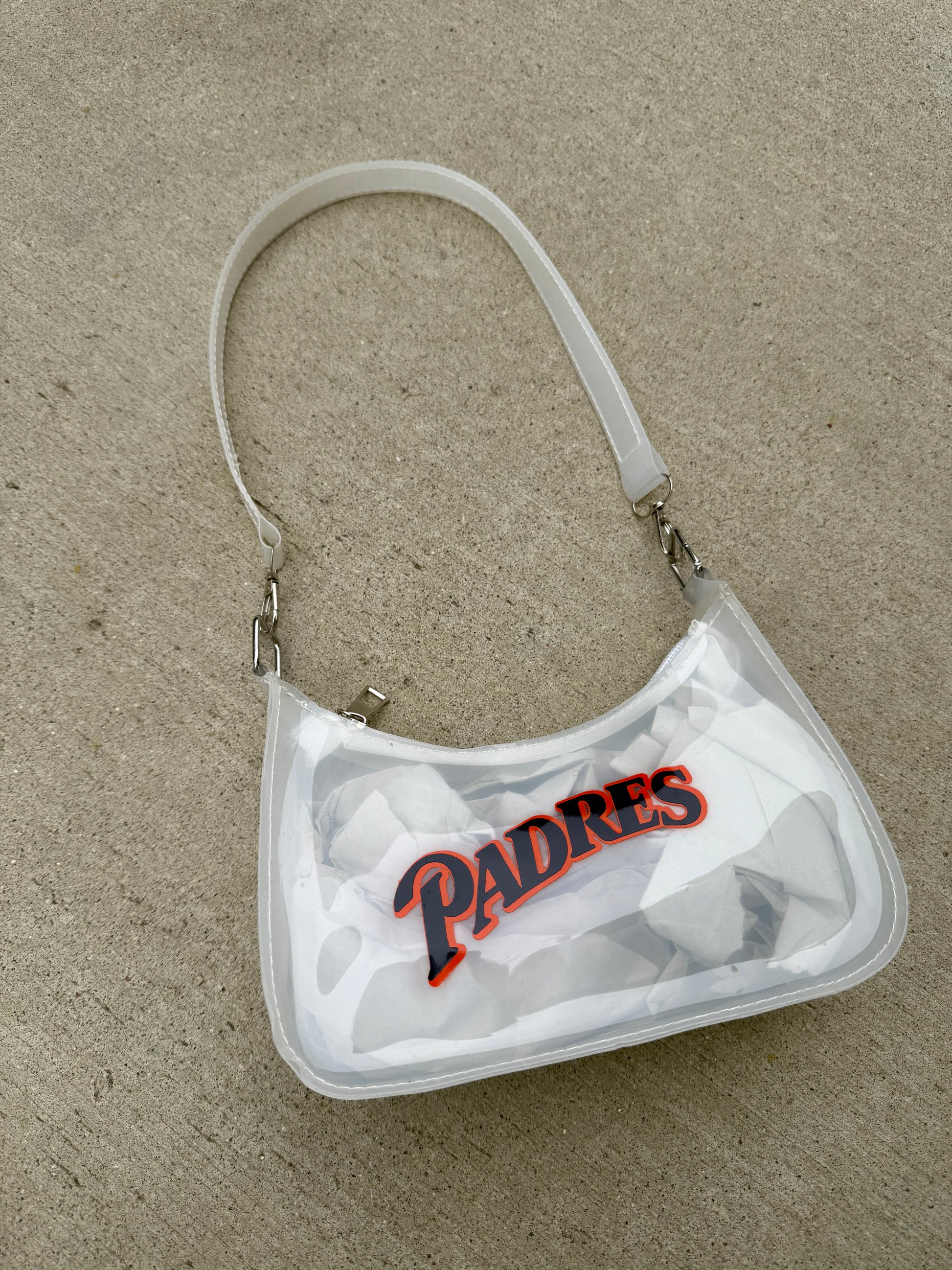 White transparent mini. Strap can be removed but not adjusted. PVC plastic material.